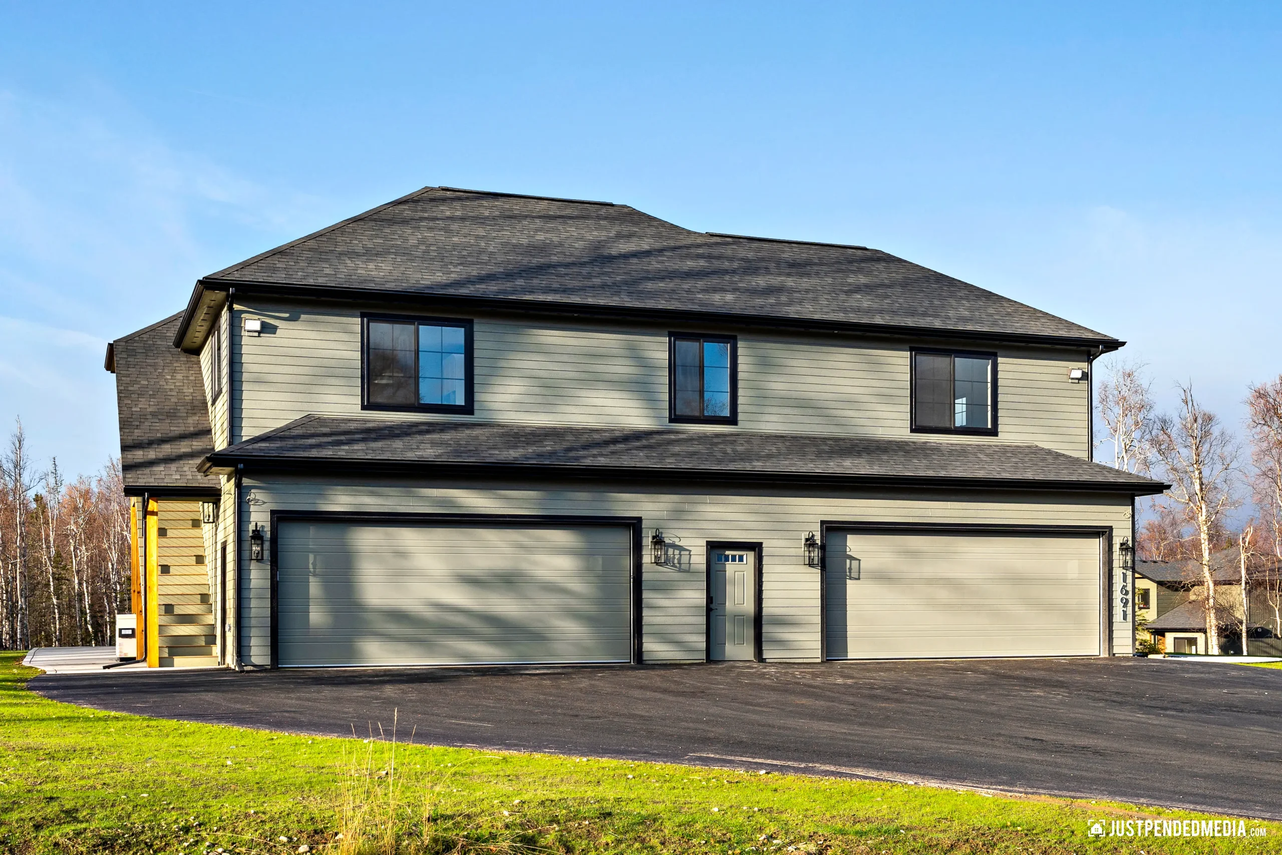 Welcome to the absolute pinnacle of luxury Alaskan real estate. Perched in a spectacular setting with jaw-dropping, unobstructed views of the water and snow-capped mountains, this $1,400,000 architectural masterpiece offers an expansive 4,546 square feet of uncompromising elegance. The striking modern exterior commands attention with its sophisticated dark siding, elegant stone accents, and a monumental 1,399-square-foot attached garage designed to house an entire fleet of vehicles and Alaskan outdoor gear. Offering 4 spacious bedrooms, a dedicated home office, and 3.75 exquisitely appointed bathrooms, this estate is built for those who demand the very best.