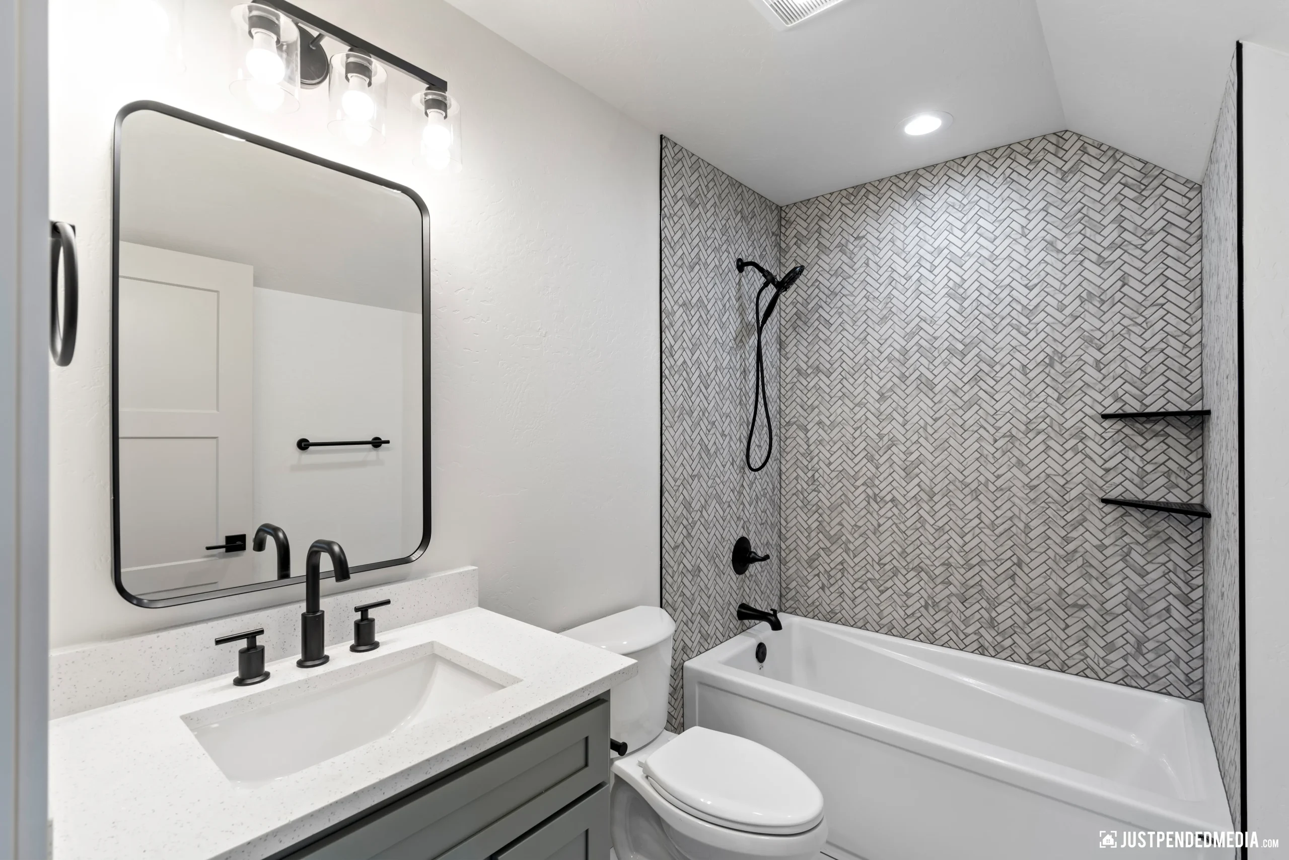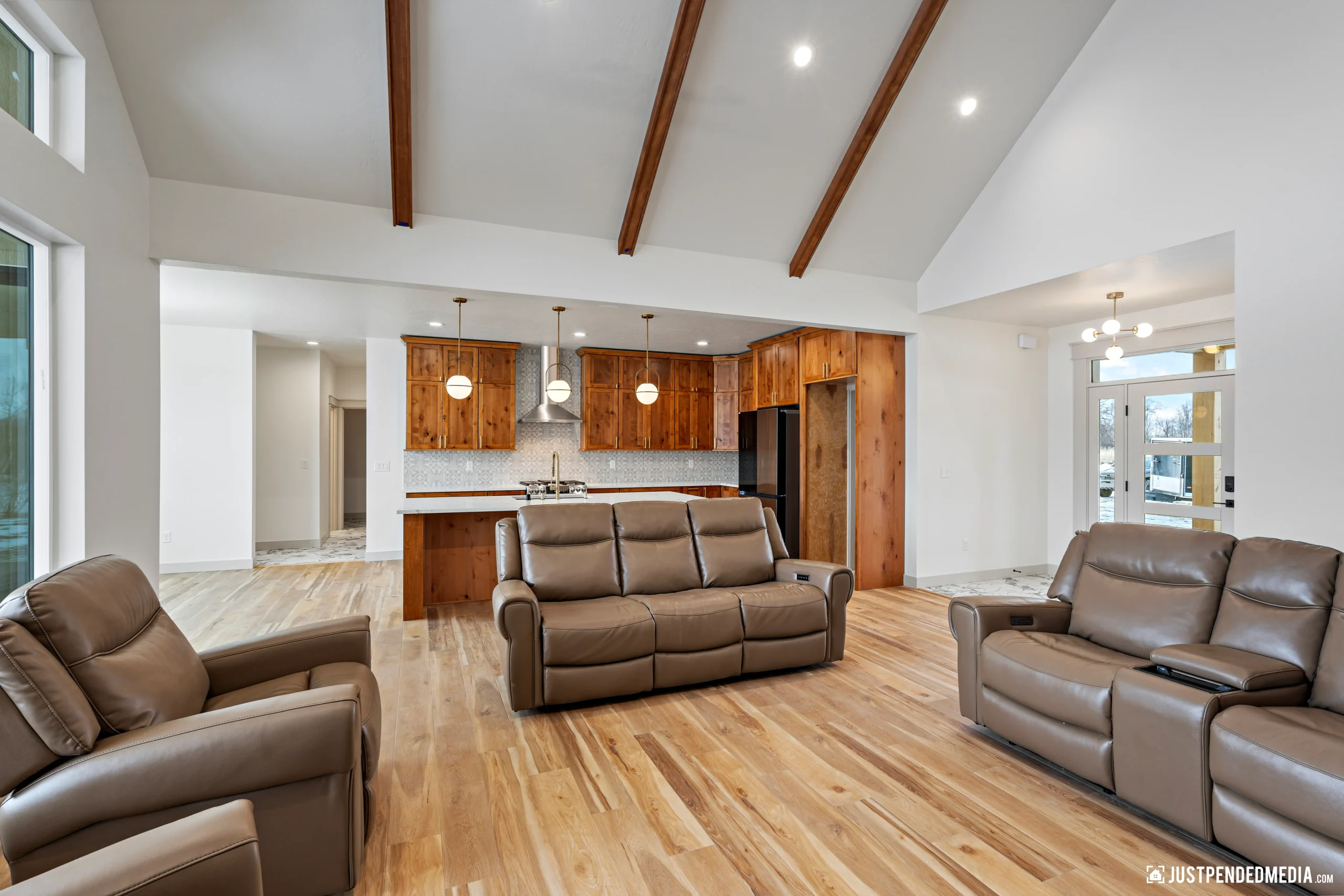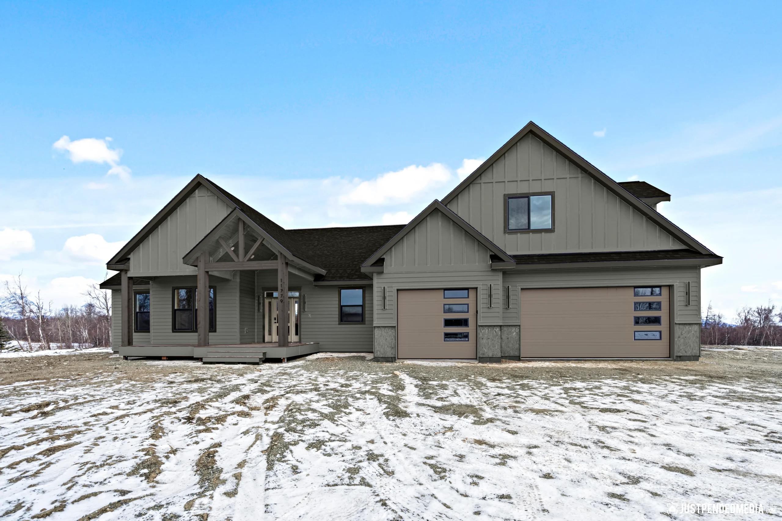 Welcome to a premier Alaskan sanctuary, where expansive living space perfectly harmonizes with breathtaking modern design. Priced at $735,000, this stunning 2,815-square-foot luxury residence offers an impressive 5 bedrooms and 2.5 bathrooms, providing abundant space for family, guests, and a dedicated home office. The home’s exterior exudes modern craftsman charm, showcasing deep, moody siding contrasted by crisp white trim, bold dark garage doors, and an inviting covered porch supported by heavy natural timber pillars.