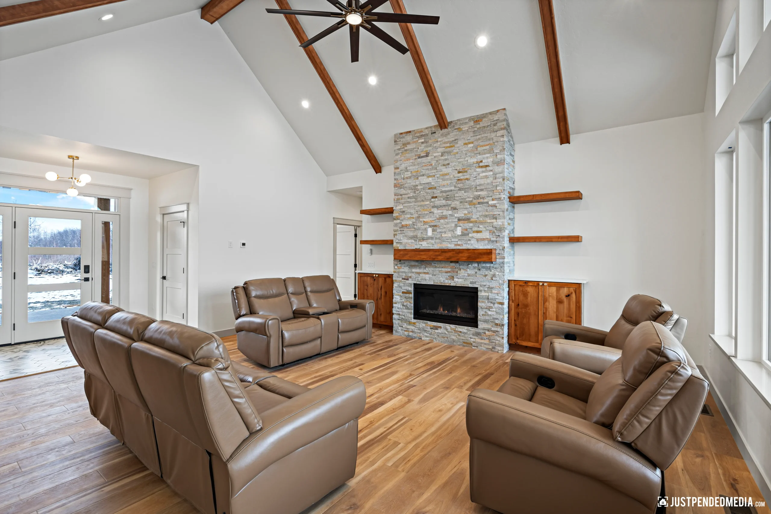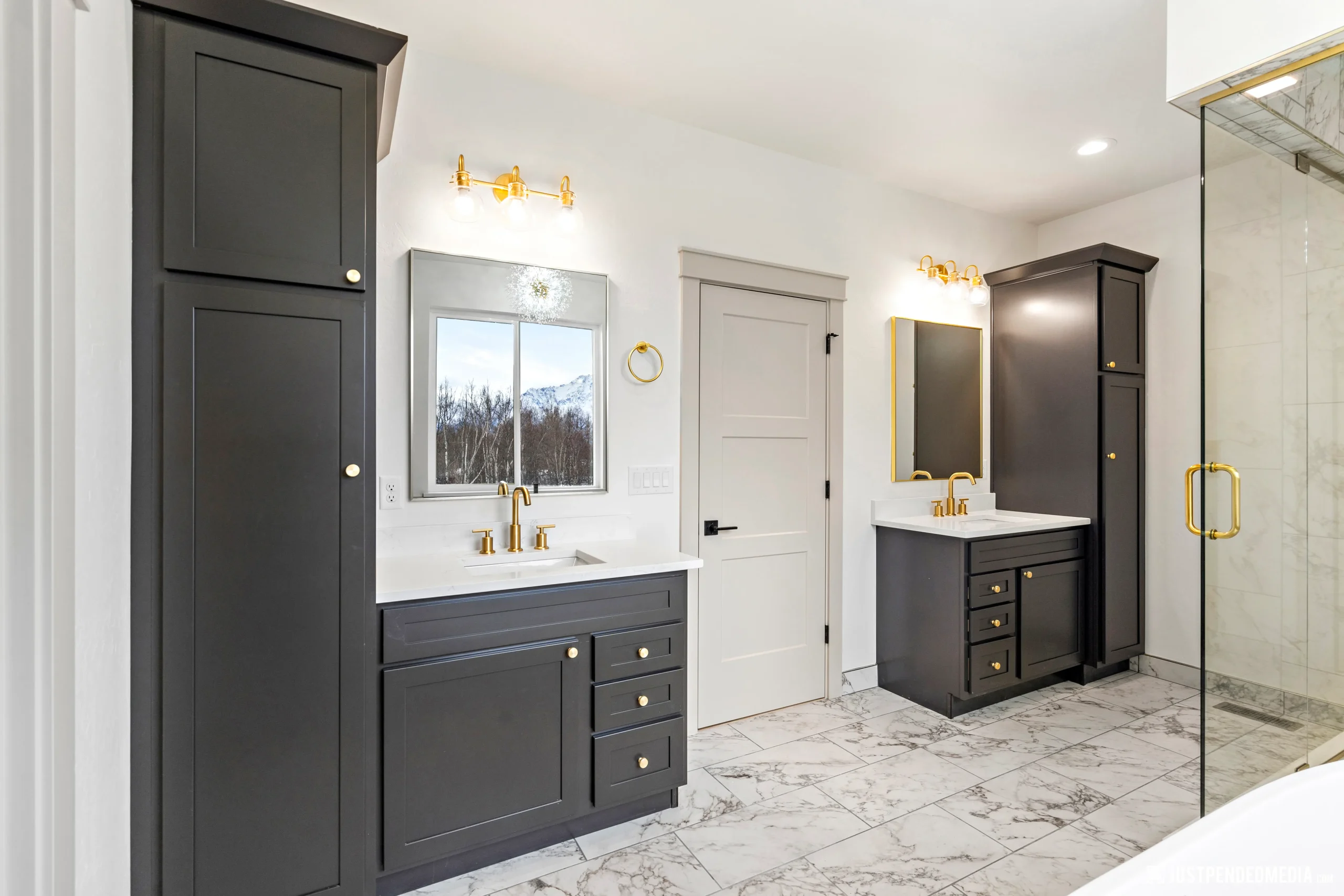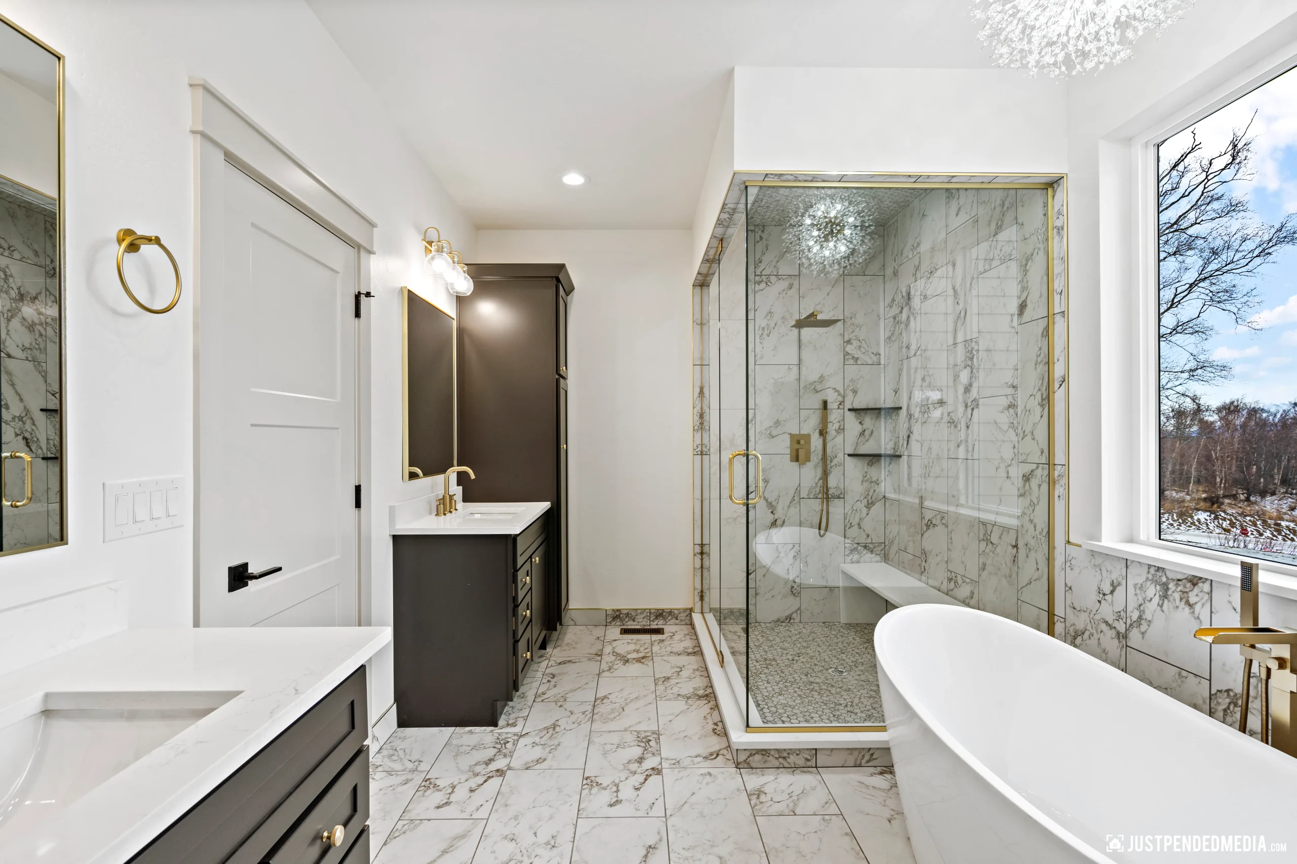 Step inside to an airy, open-concept great room anchored by soaring vaulted ceilings and an abundance of natural light pouring in through massive picture windows. The focal point of the living area is a striking floor-to-ceiling dark stone fireplace, flowing seamlessly into a spectacular designer kitchen. Here, you will find a sophisticated two-tone aesthetic featuring crisp white upper cabinetry, warm natural wood base cabinets, and pristine quartz countertops. The primary suite offers a true five-star spa experience, boasting an incredible walk-in shower enveloped in rich emerald green vertical tile, a freestanding soaking tub, and brushed gold fixtures. Complete with a monumental 1,124-square-foot attached garage, this home is the ultimate basecamp for luxurious Alaskan living.