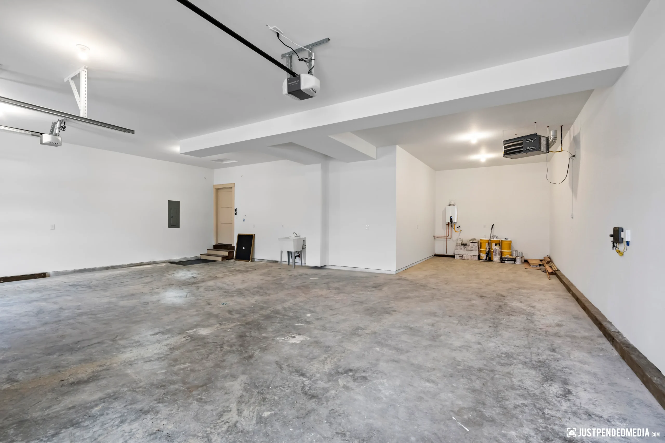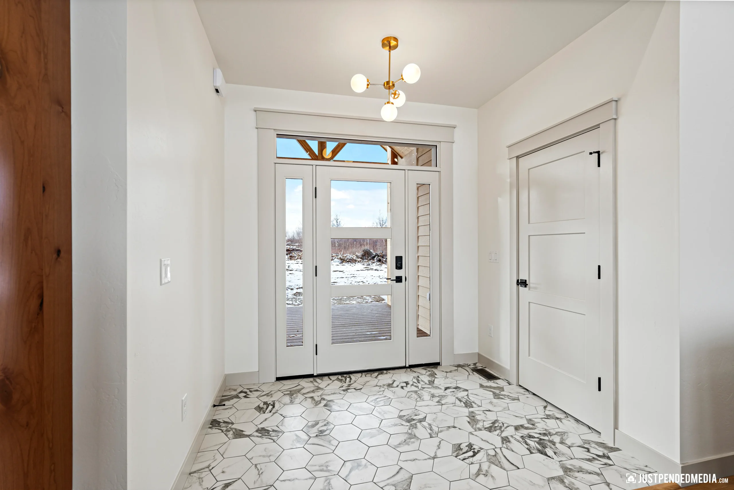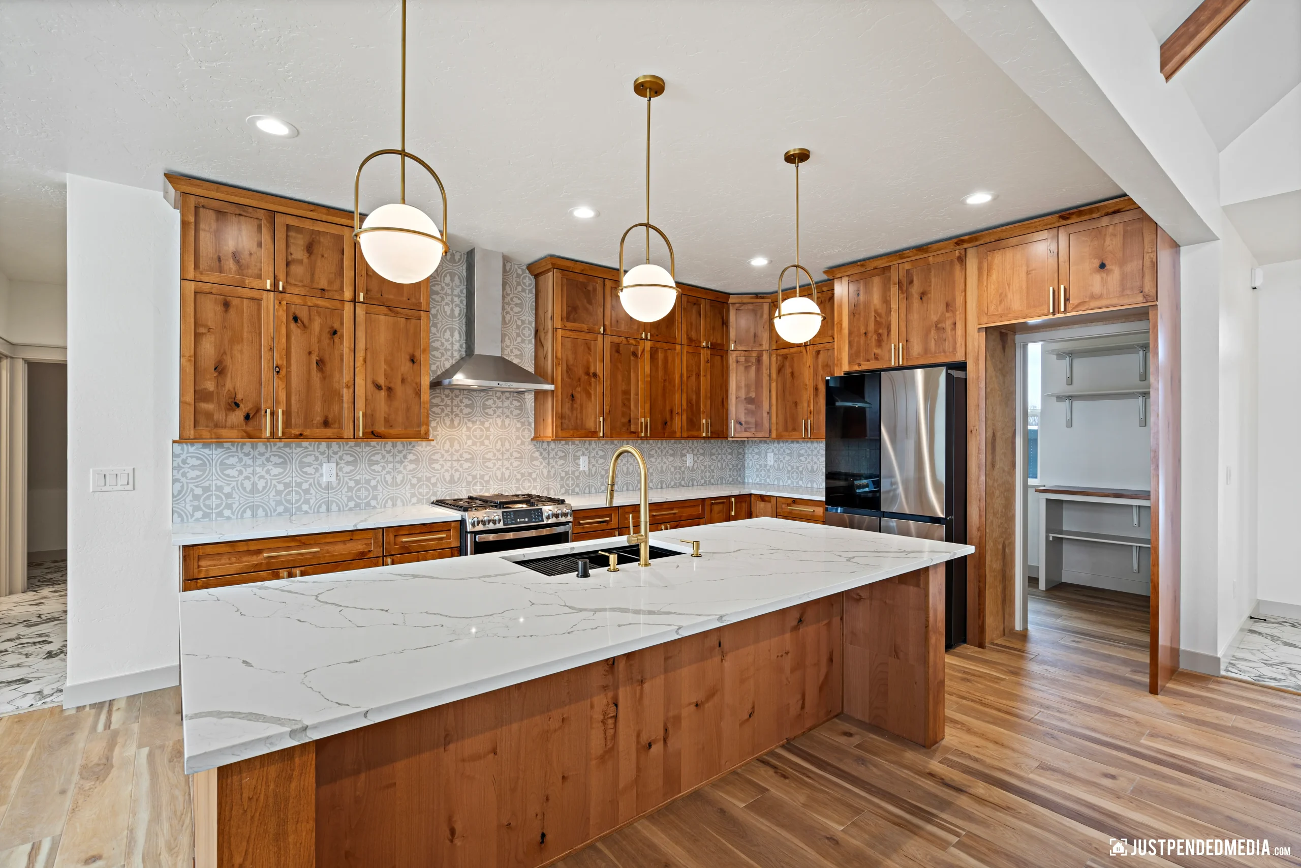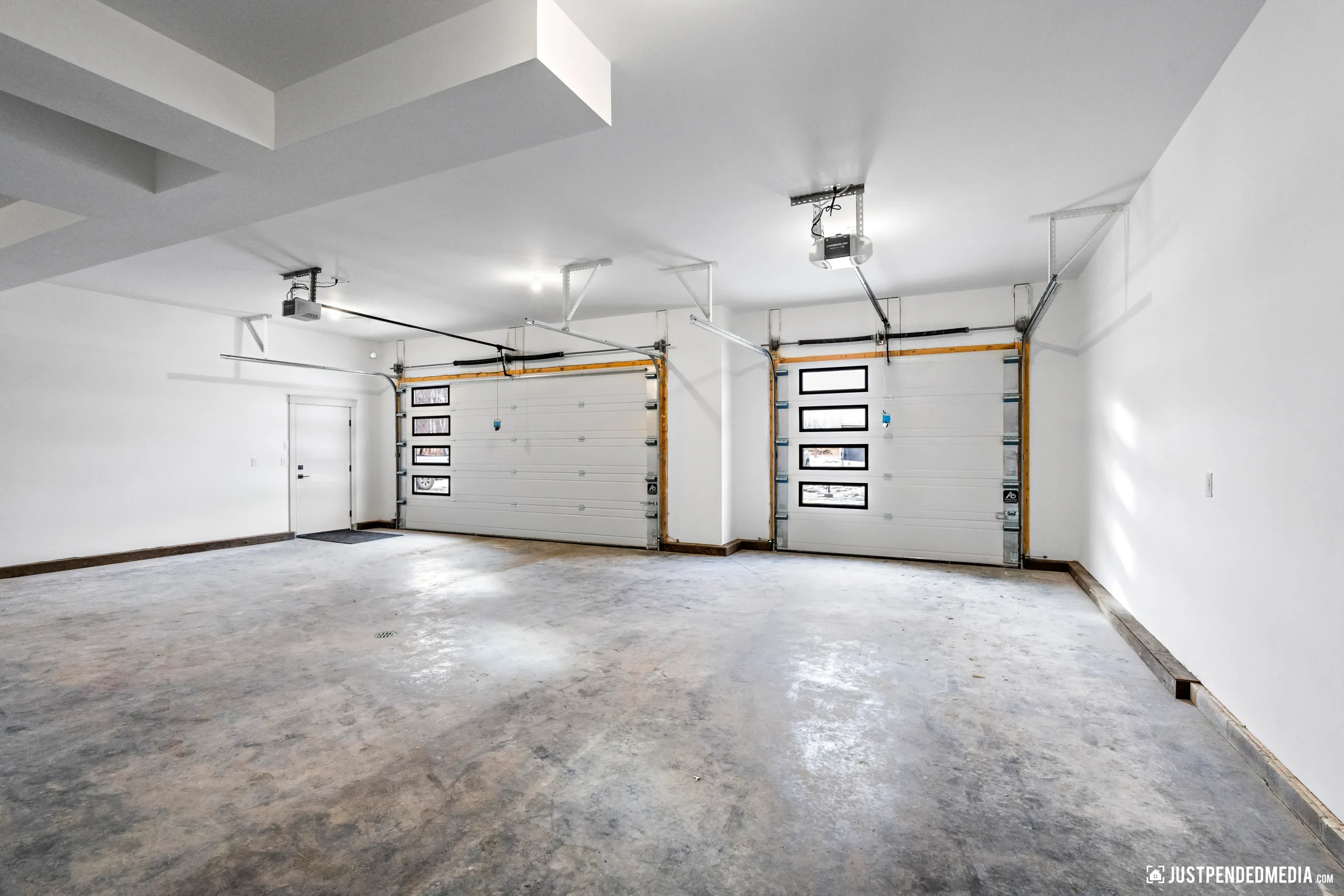 Step inside to an airy, open-concept great room anchored by soaring vaulted ceilings and an abundance of natural light pouring in through massive picture windows. The focal point of the living area is a striking floor-to-ceiling dark stone fireplace, flowing seamlessly into a spectacular designer kitchen. Here, you will find a sophisticated two-tone aesthetic featuring crisp white upper cabinetry, warm natural wood base cabinets, and pristine quartz countertops. The primary suite offers a true five-star spa experience, boasting an incredible walk-in shower enveloped in rich emerald green vertical tile, a freestanding soaking tub, and brushed gold fixtures. Complete with a monumental 1,124-square-foot attached garage, this home is the ultimate basecamp for luxurious Alaskan living.