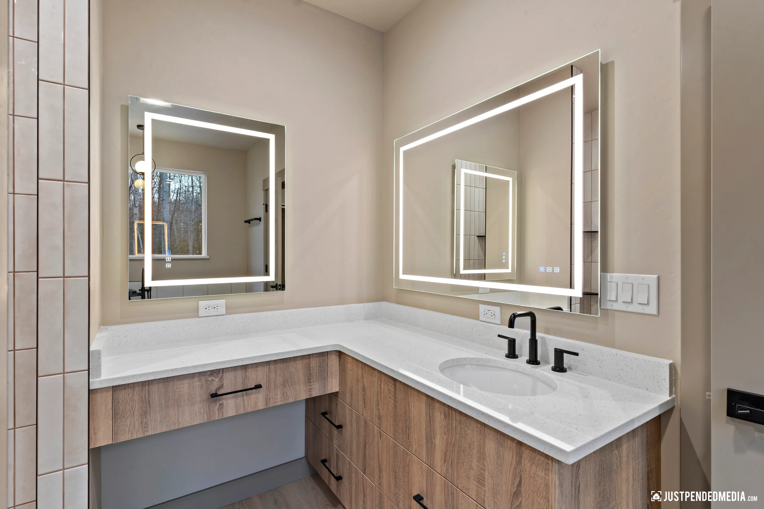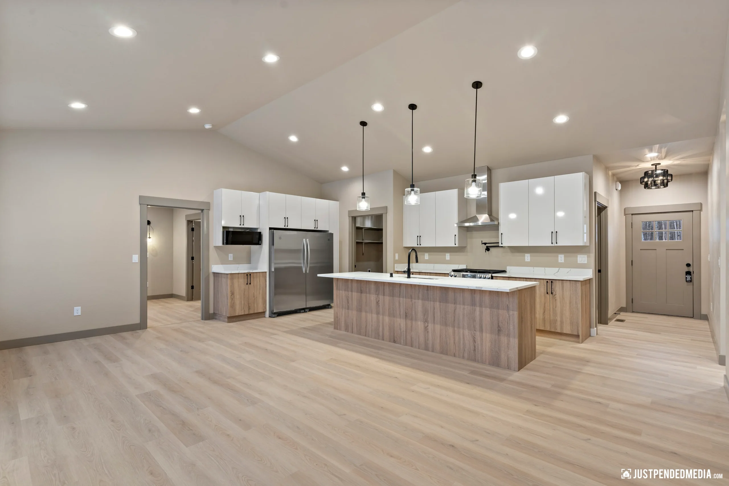 Step inside to discover a bright, airy open-concept living space anchored by soaring vaulted ceilings, durable wood-look flooring, and a modern multi-blade ceiling fan. The designer kitchen is a true focal point, showcasing trendy two-tone cabinetry with dark bases and natural wood uppers, pristine white quartz countertops, and a bold black hexagon tile backsplash. A dedicated office space enclosed by elegant glass French doors provides the ultimate flexibility for remote work. Complete with a custom built-in mudroom, boutique-style closets, and an expansive covered back deck overlooking the birch forest, this turnkey home is perfectly tailored for the modern Alaskan lifestyle.