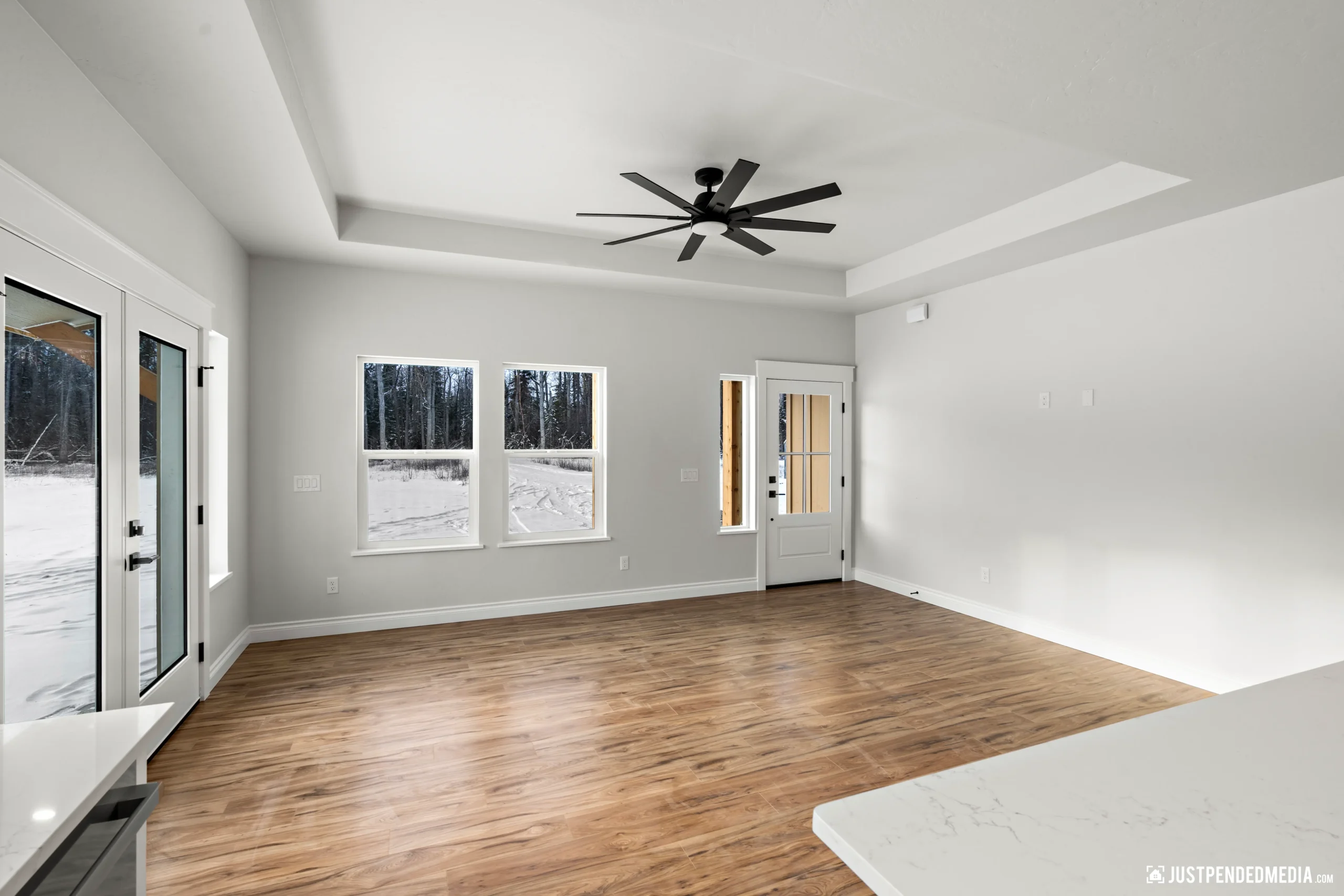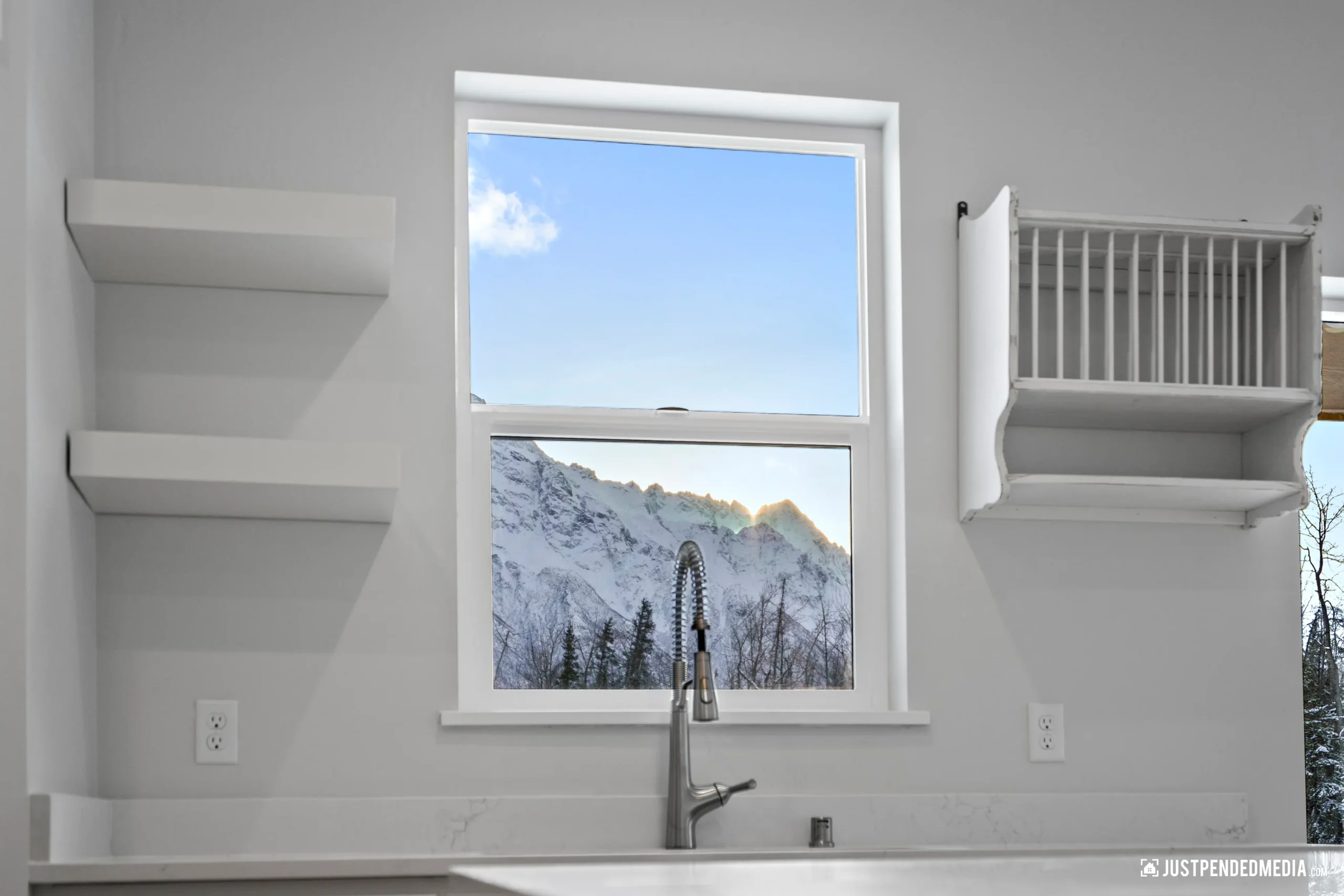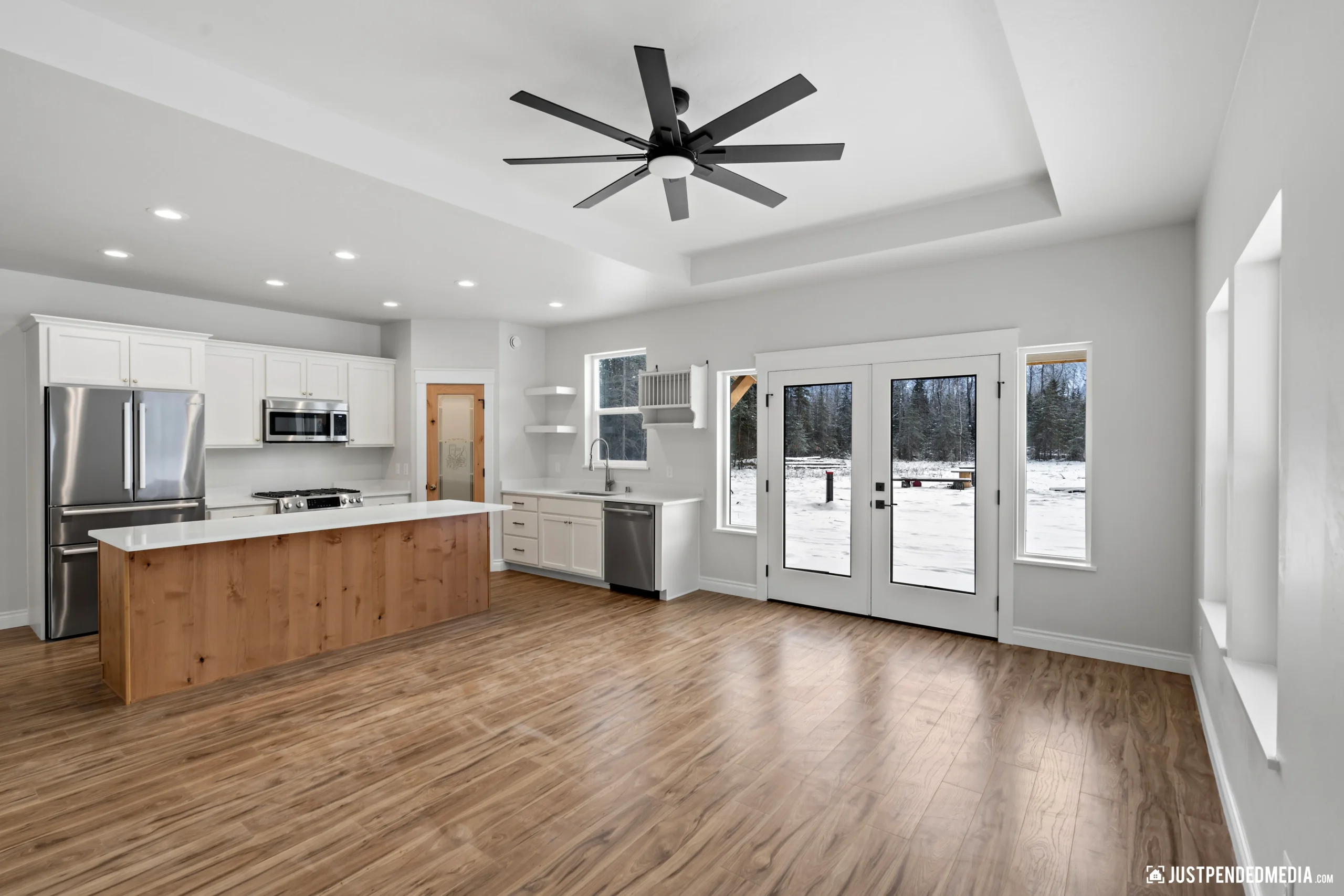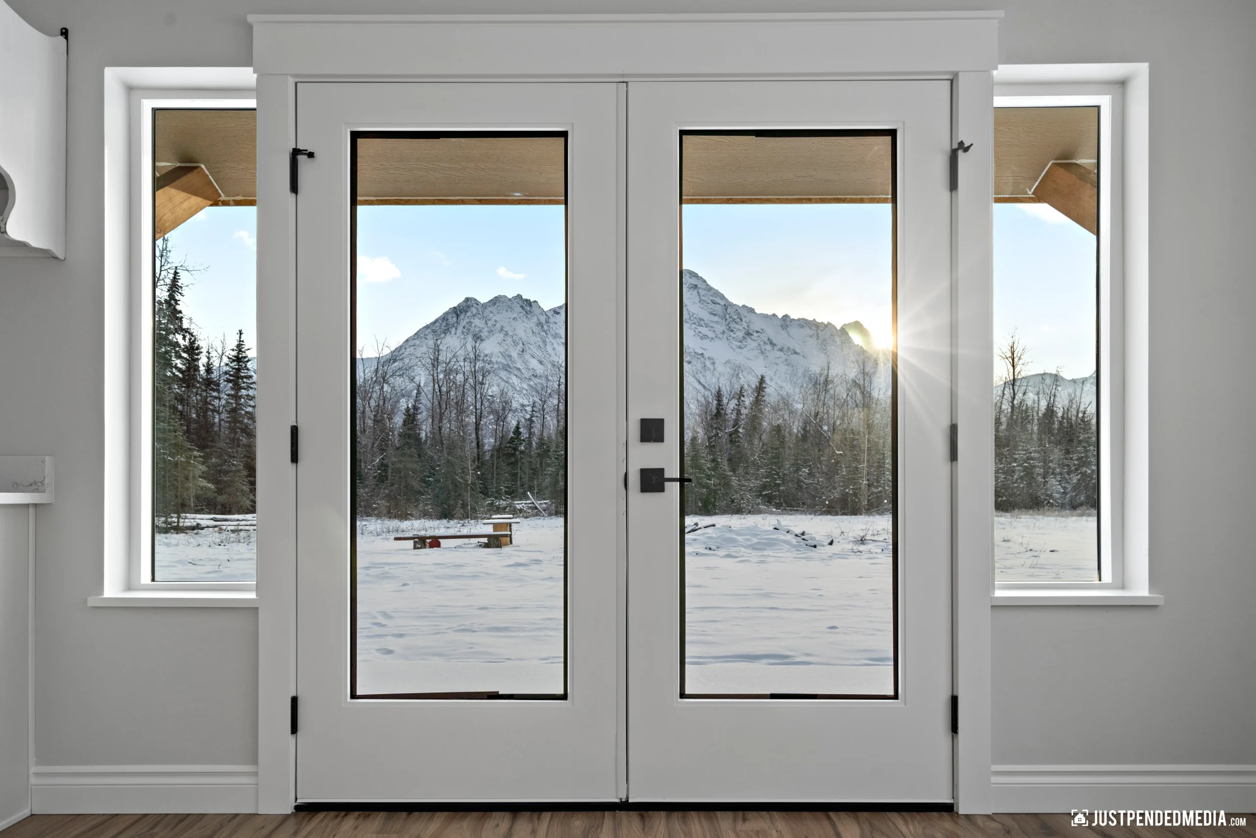 Step through the elegant glass French doors into a bright, open-concept living area bathed in natural light, featuring tray ceilings and sweeping, unobstructed views of the majestic snow-capped mountain peaks. The gourmet kitchen is a masterpiece of design, blending crisp white cabinetry and quartz countertops with a warm, natural wood-paneled island and premium stainless steel appliances. With thoughtful details like a built-in mudroom drop zone, an elegant bathroom with gold accents, and durable wood-look flooring throughout, this turnkey property is the perfect low-maintenance haven for outdoor enthusiasts who refuse to compromise on modern style.