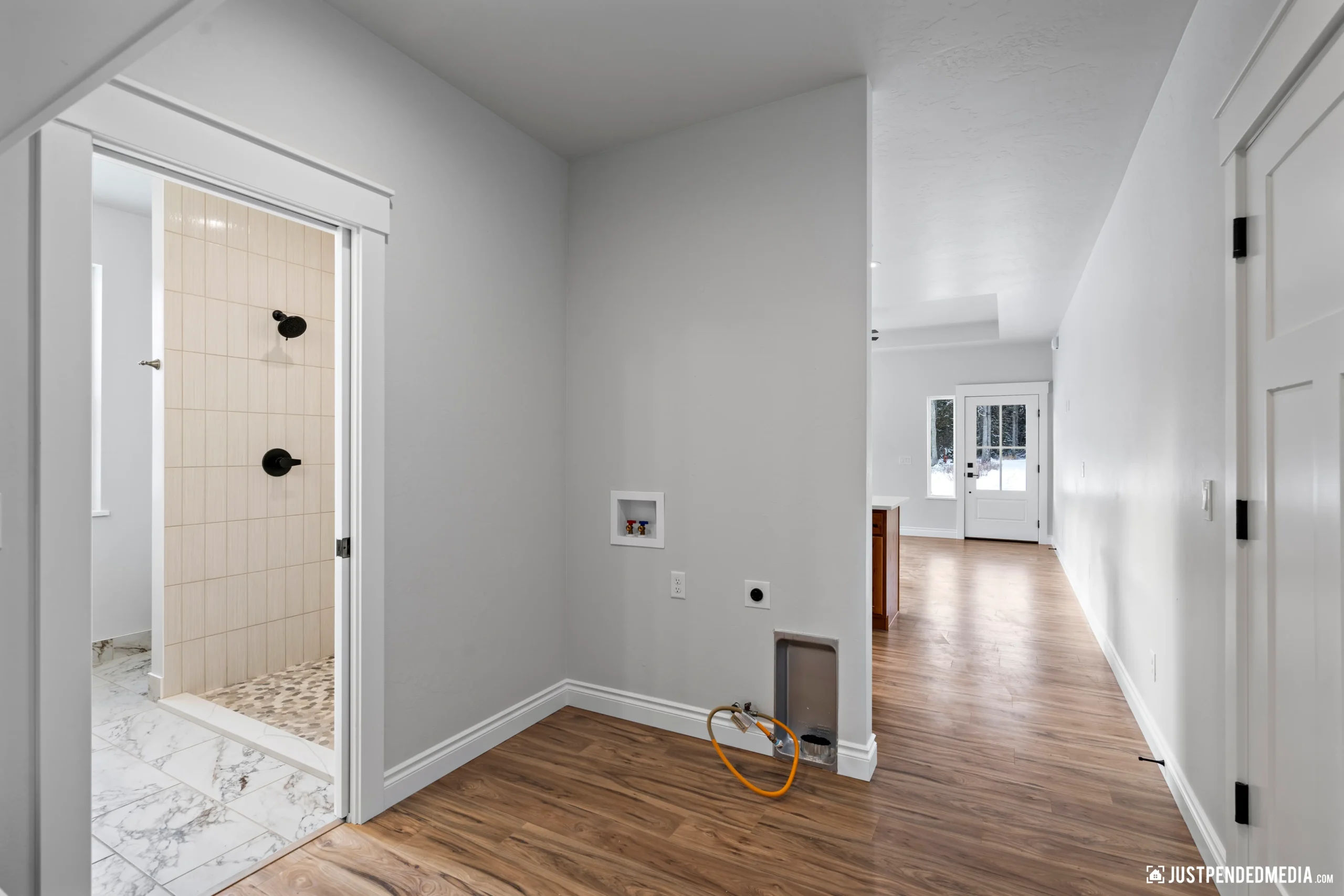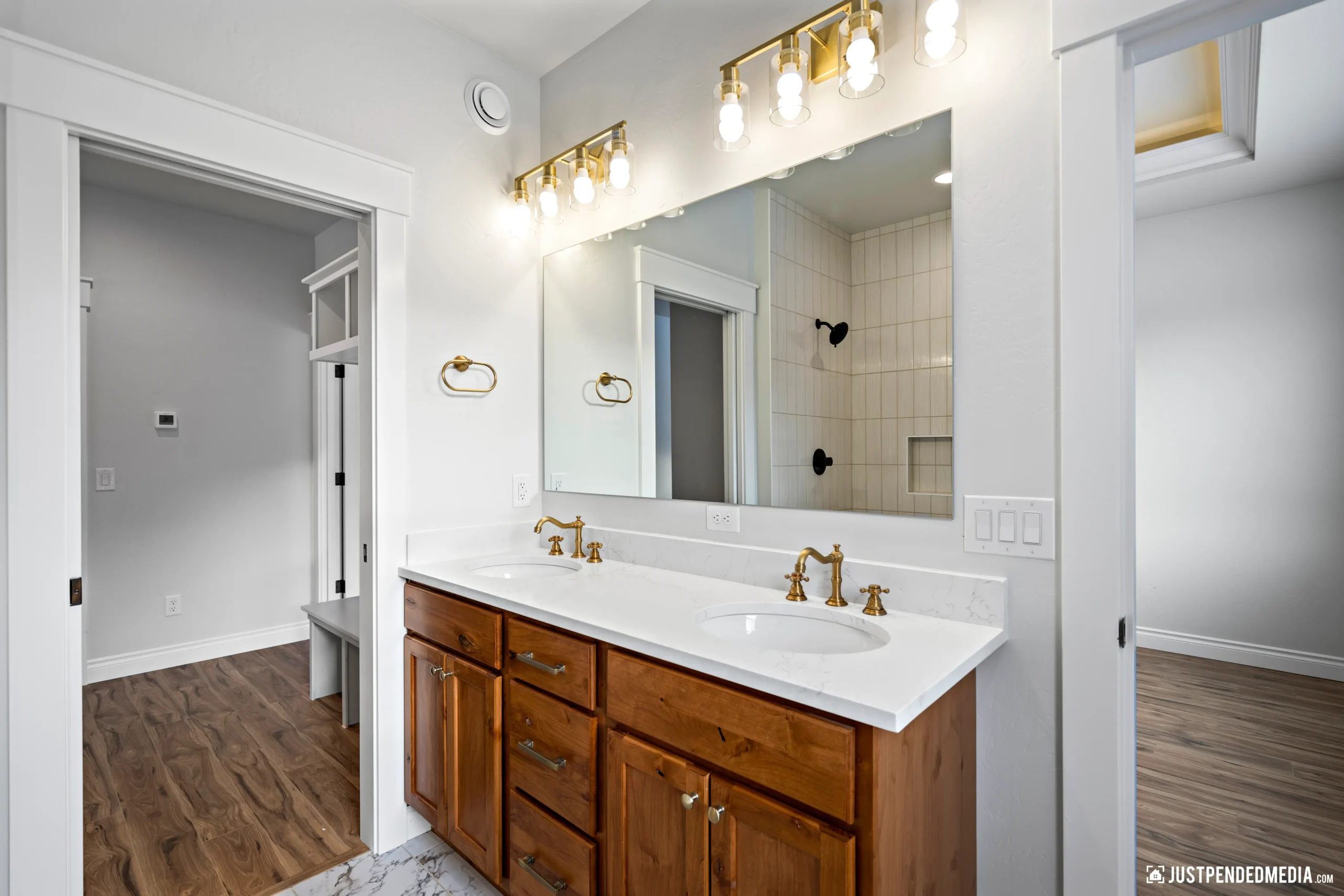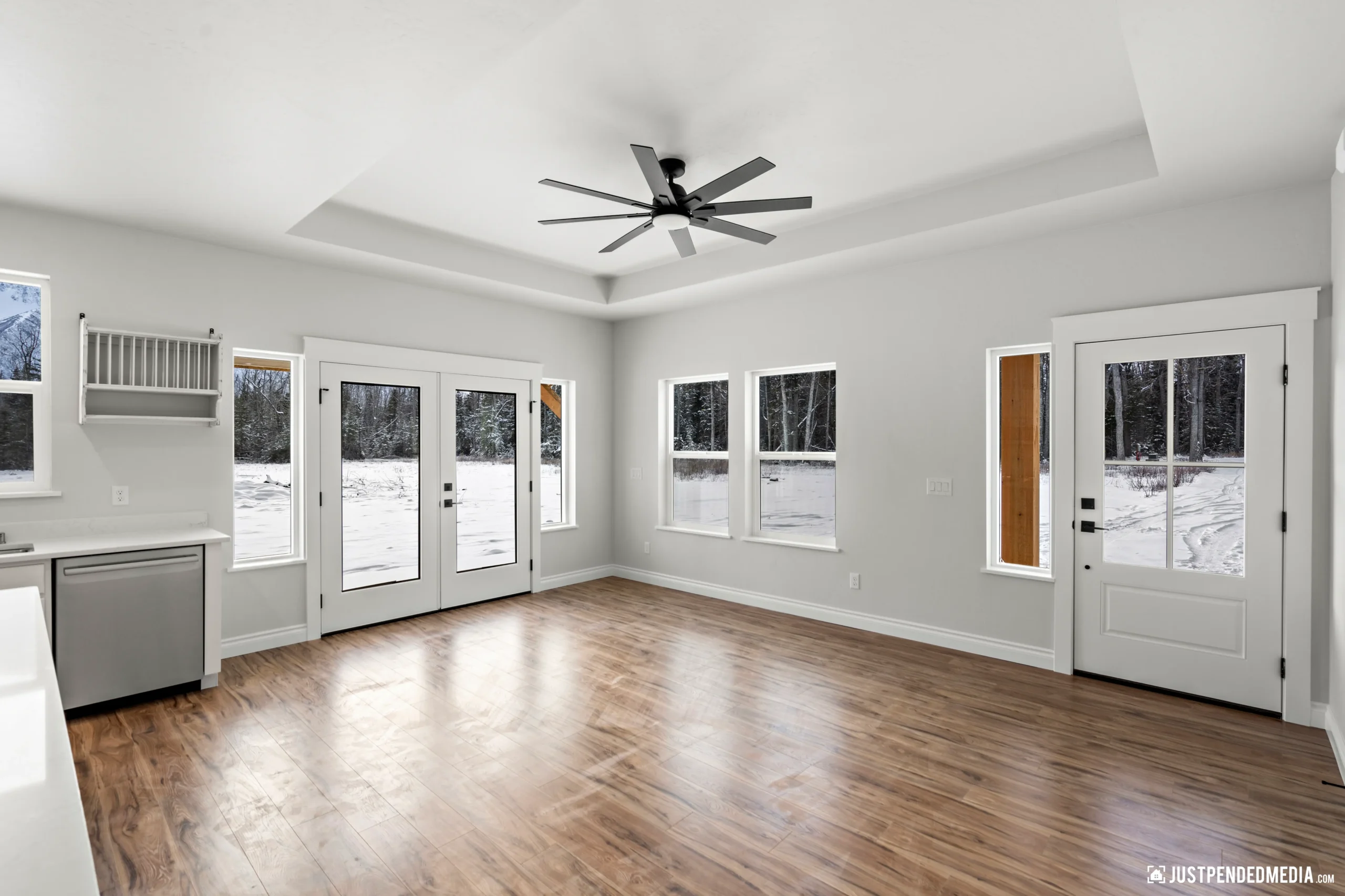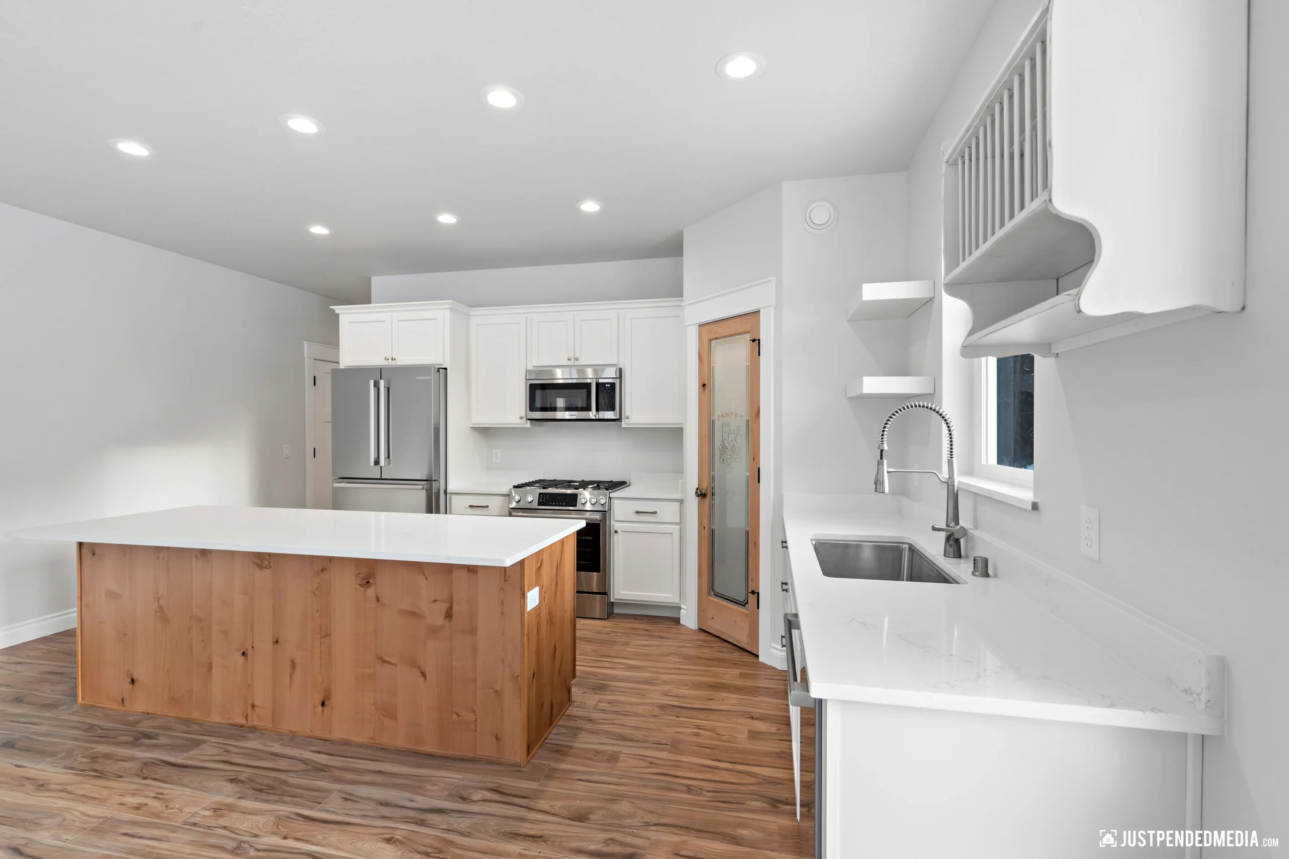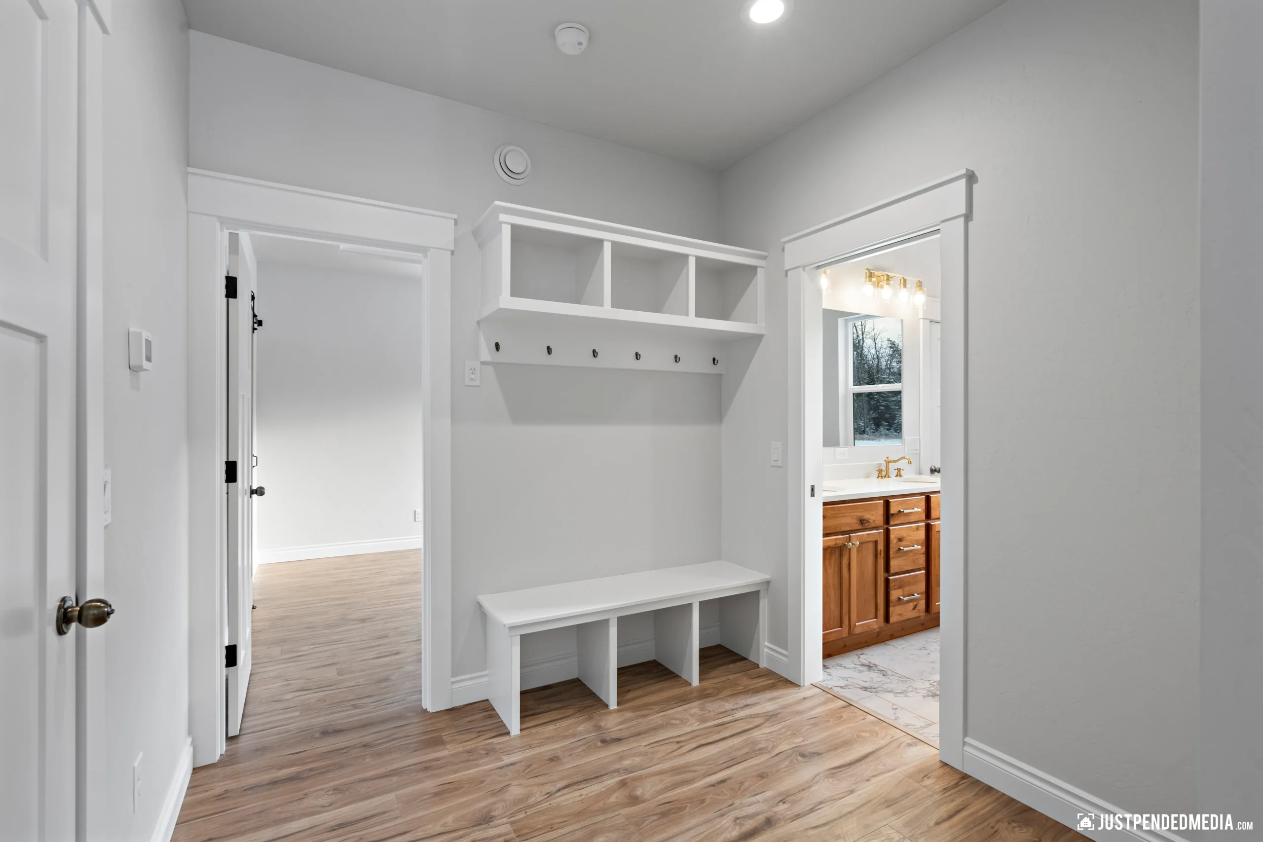 Step through the elegant glass French doors into a bright, open-concept living area bathed in natural light, featuring tray ceilings and sweeping, unobstructed views of the majestic snow-capped mountain peaks. The gourmet kitchen is a masterpiece of design, blending crisp white cabinetry and quartz countertops with a warm, natural wood-paneled island and premium stainless steel appliances. With thoughtful details like a built-in mudroom drop zone, an elegant bathroom with gold accents, and durable wood-look flooring throughout, this turnkey property is the perfect low-maintenance haven for outdoor enthusiasts who refuse to compromise on modern style.