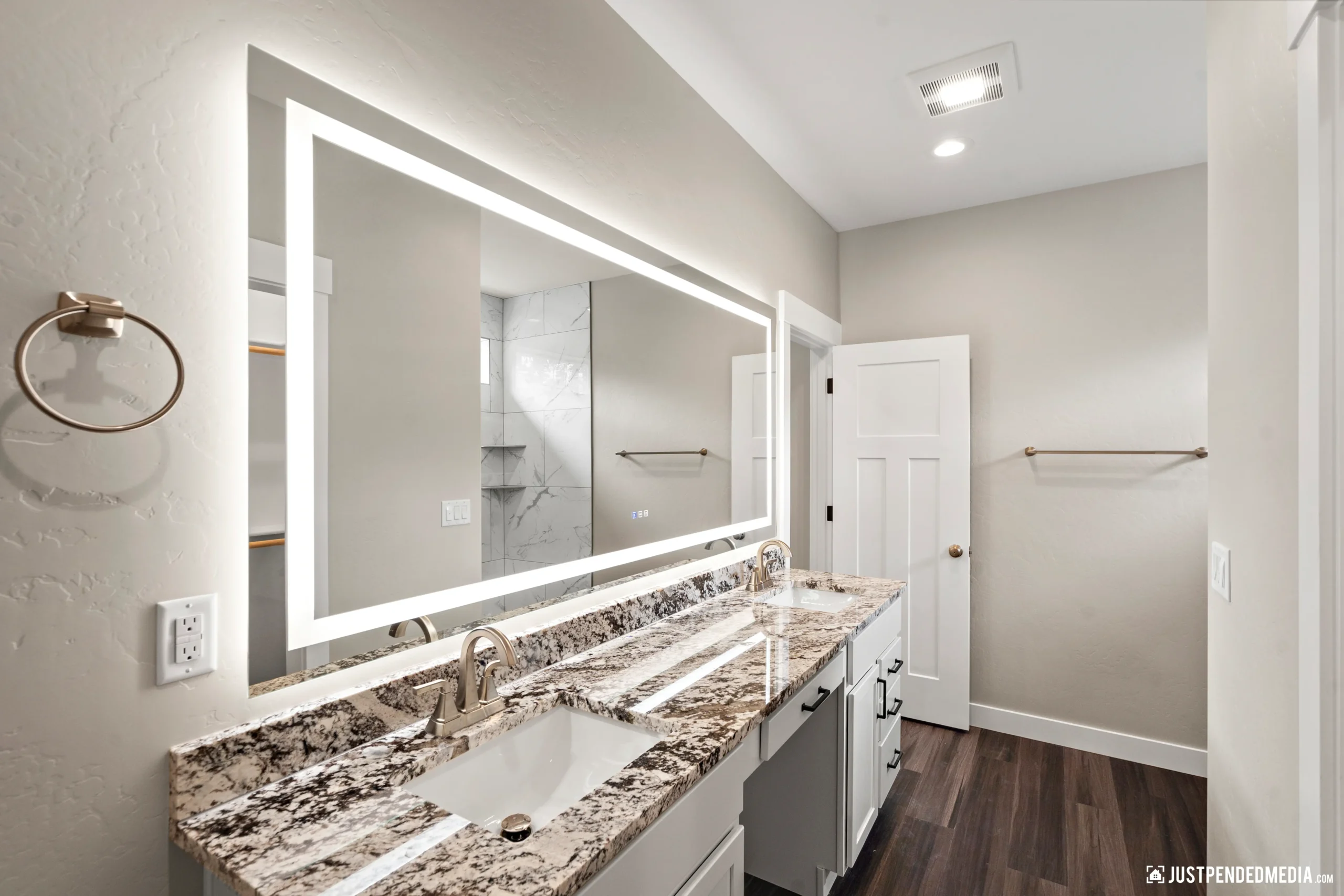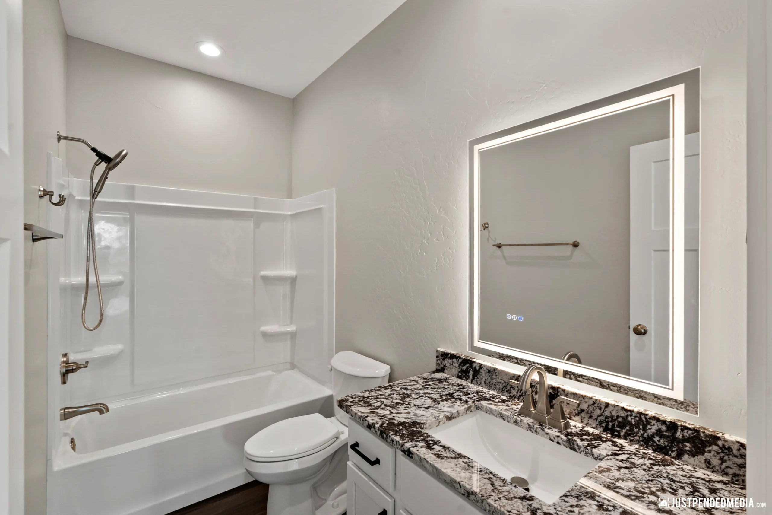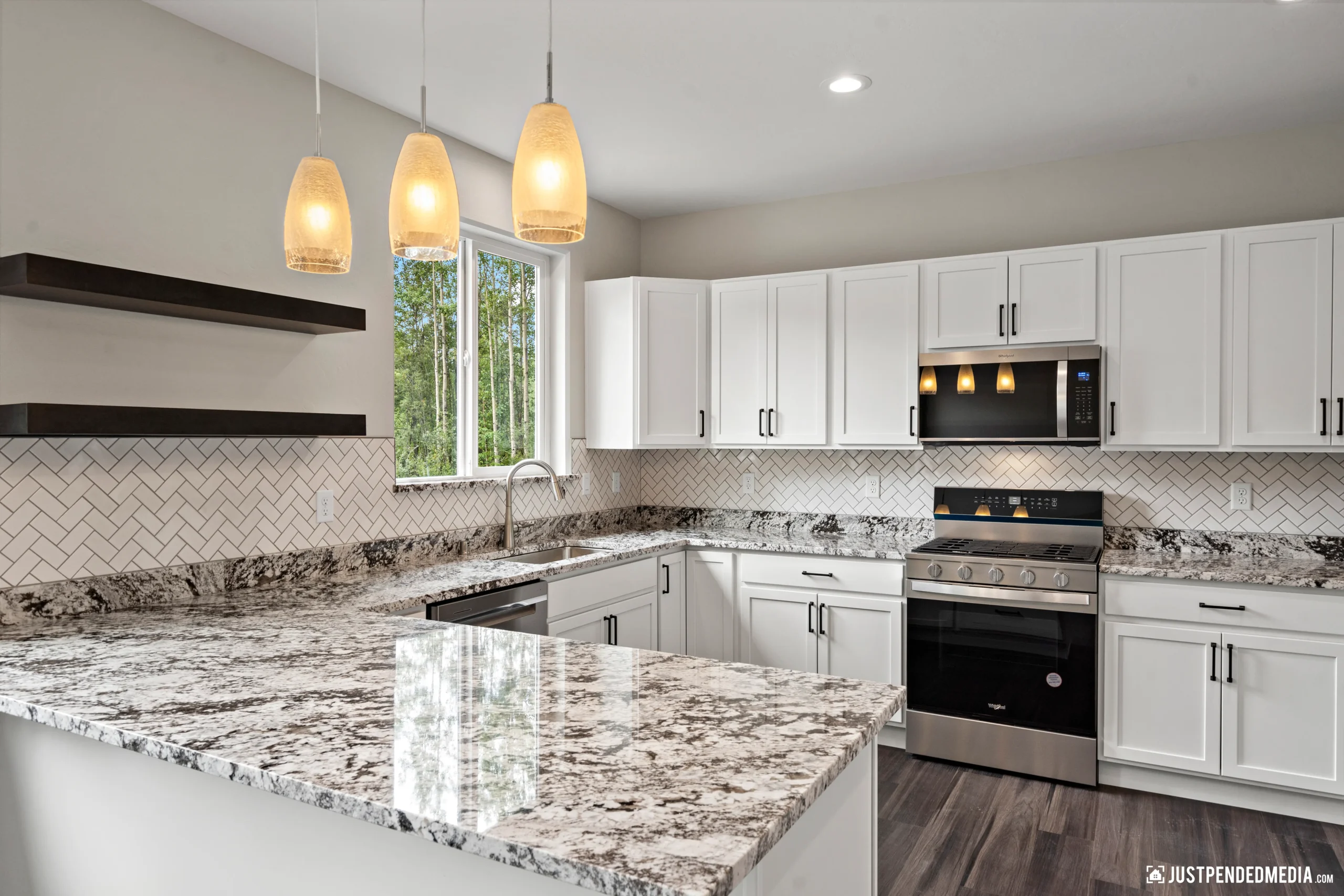 Step inside to a bright, open-concept living area boasting vaulted ceilings, sleek dark wood-look flooring, and modern lighting fixtures. The heart of the home is a stunning kitchen equipped with white shaker cabinetry, striking granite countertops, and premium stainless steel appliances. The primary suite offers a private retreat with a luxurious en-suite bathroom featuring a custom tiled walk-in shower and an oversized LED-backlit mirror. Complete with a dedicated laundry area and a substantial 688-square-foot heated garage ready for winter, this home effortlessly combines elegant modern finishes with practical Alaskan utility.