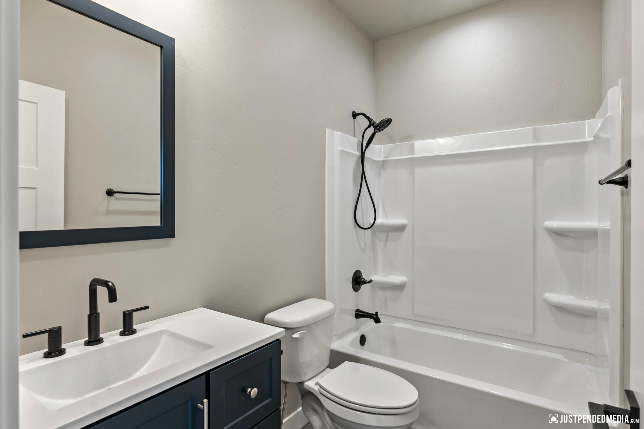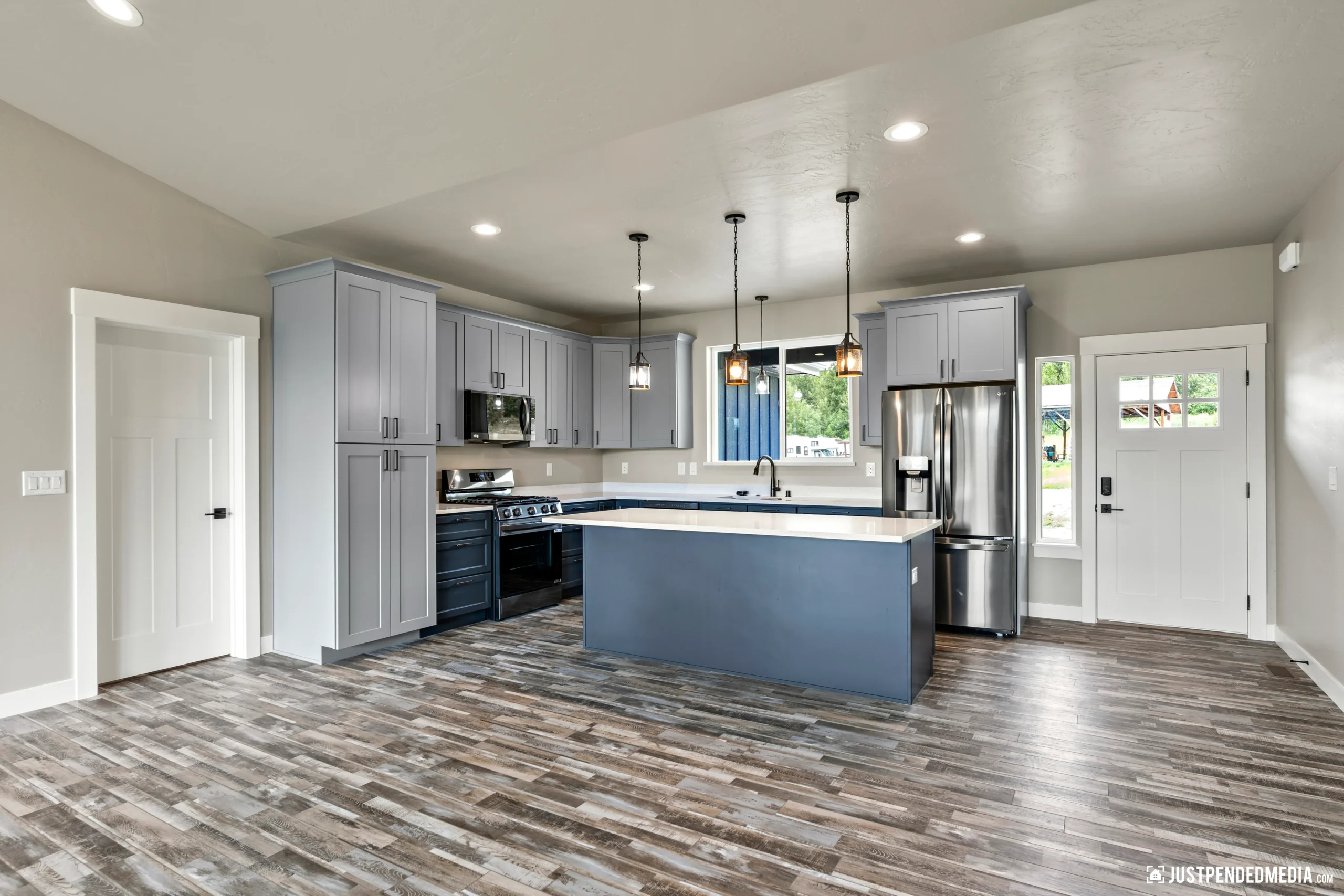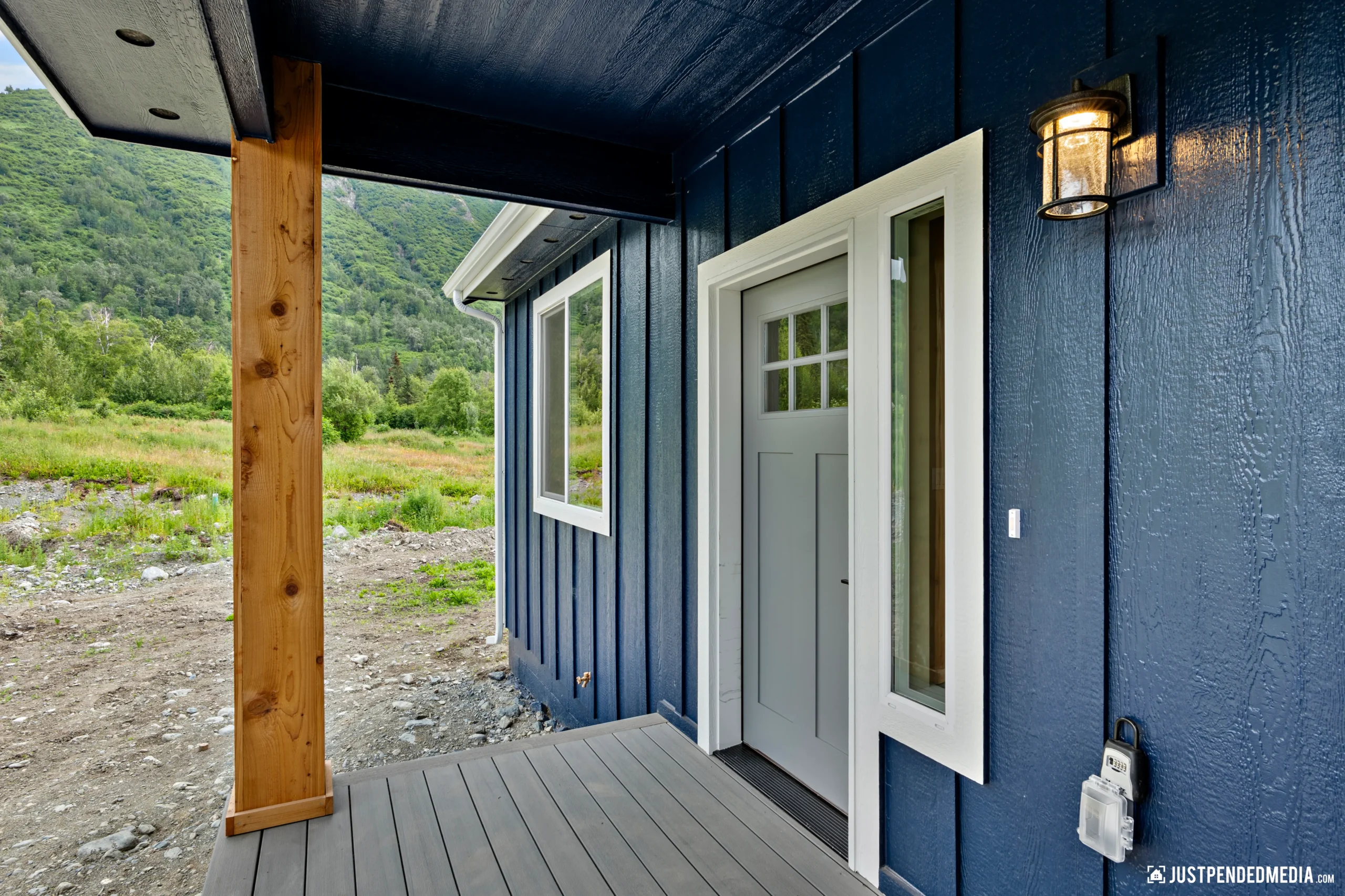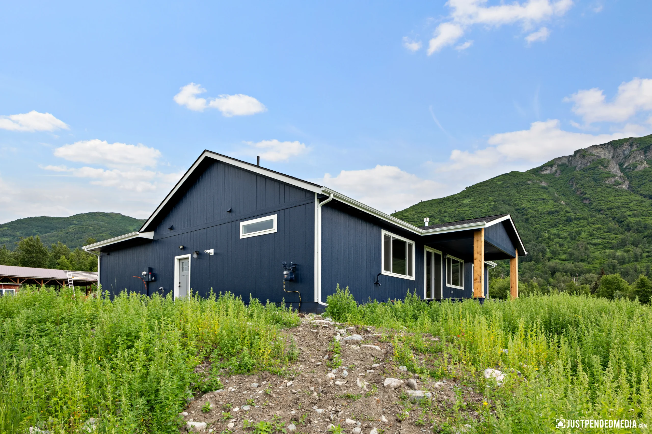 Welcome to this striking new-construction home, perfectly positioned to capture sweeping Alaskan mountain views. Priced at a highly attractive $345,000, this meticulously designed property offers 1,344 square feet of highly efficient living space, featuring 3 bedrooms and 2 bathrooms. The exterior makes an immediate statement with its deep navy blue board-and-batten style siding, crisp white trim, and a rustic natural wood porch column that perfectly complements the rugged landscape.